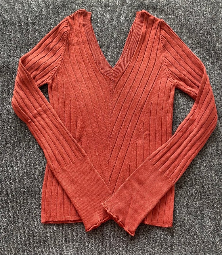 V yaka ve uzun kollu, yumuşak örgü kumaştan yapılmış, fit kesim kırmızı kadın kazak. İnce fitilli dokusu ve normal uzunluğu ile günlük sokak stiline uygun.