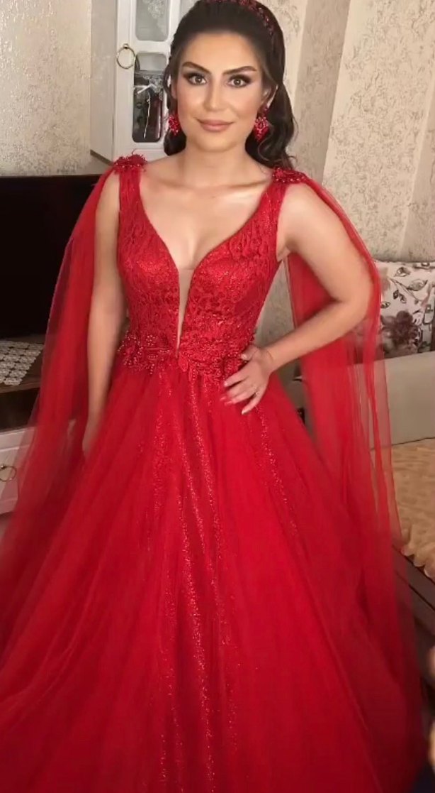 Parlak kırmızı renkte, derin V yakalı ve işlemeli, drapeli detaylı uzun kollu abiye elbise, modern klasik tarzda şıklık sunar.