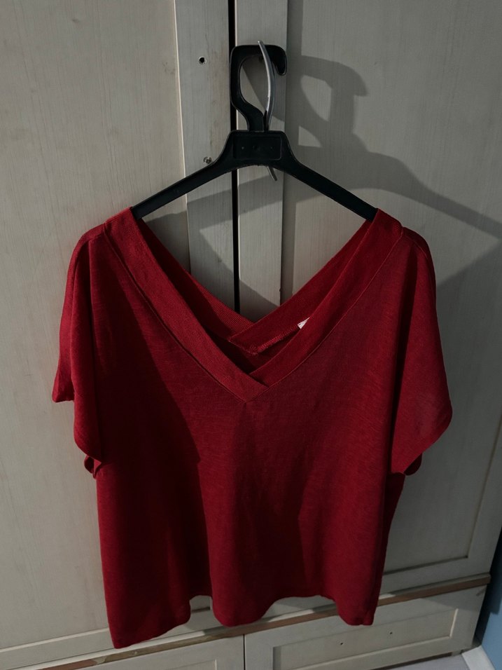 V yakalı, kısa kollu, rahat kesim kırmızı kadın bluz. Minimalist ve desen içermeyen tasarımıyla günlük kullanıma uygundur. Koton marka