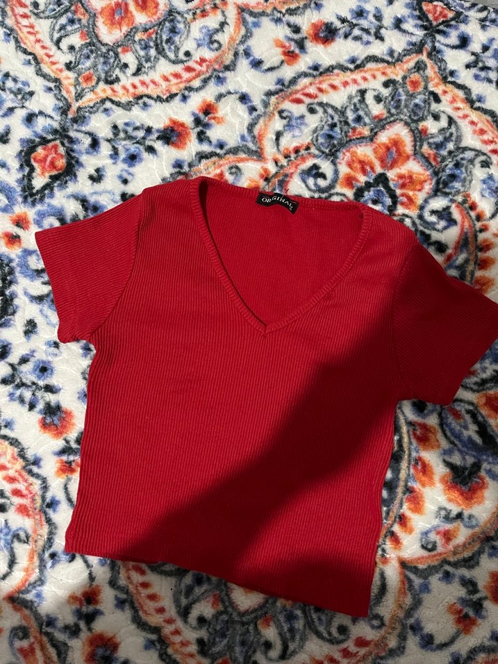 Kırmızı V Yakalı Kadın Kısa Kollu Tişört