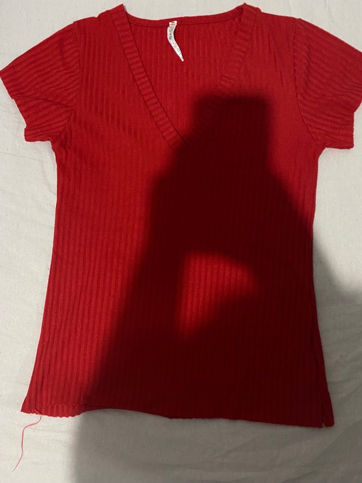 Kırmızı, V yakalı, kısa kollu ve normal boyda olan bu tişört, pamuklu yumuşak kumaştan üretilmiştir. Minimalist tasarımıyla günlük sokak stiline uygundur.
