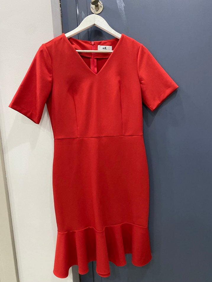 V yakalı, kısa kollu, kırmızı midi elbise, oturan kesimi ve modern tarzıyla ofis için şık ve iddialı bir seçimdir.