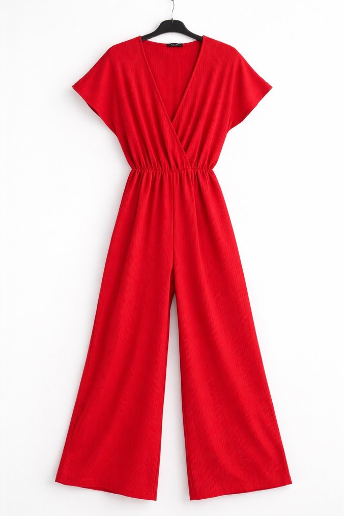 Kırmızı V Yakalı Kadın Midi Tulum
