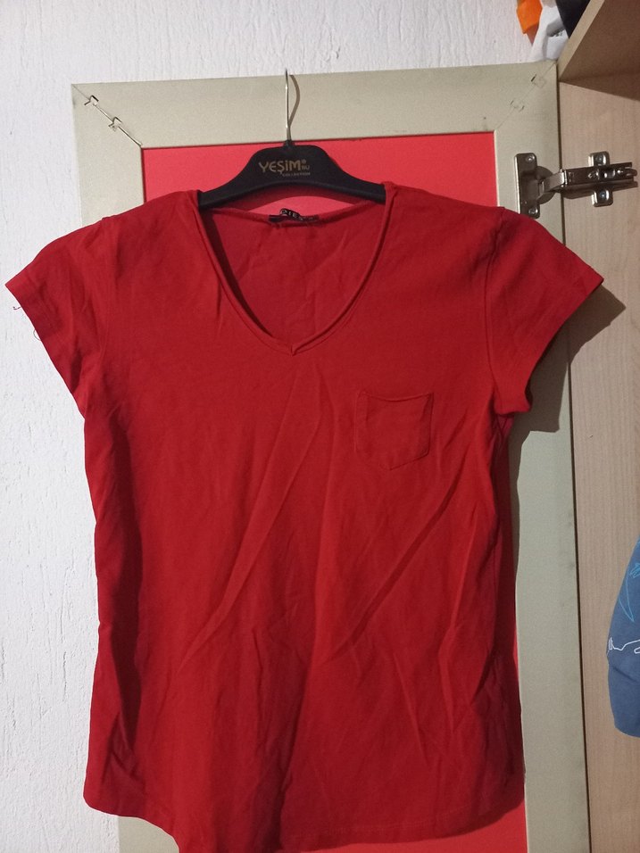Pamuk kumaştan yapılmış, parlak kırmızı renkli, V yakalı ve kısa kollu, göğüs cepli, normal boyda, dar kesim kadın tişörtü.