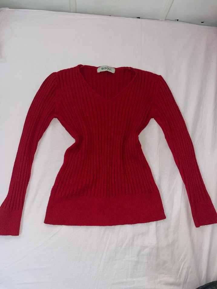 Kırmızı V Yakalı Kadın Triko Kazak