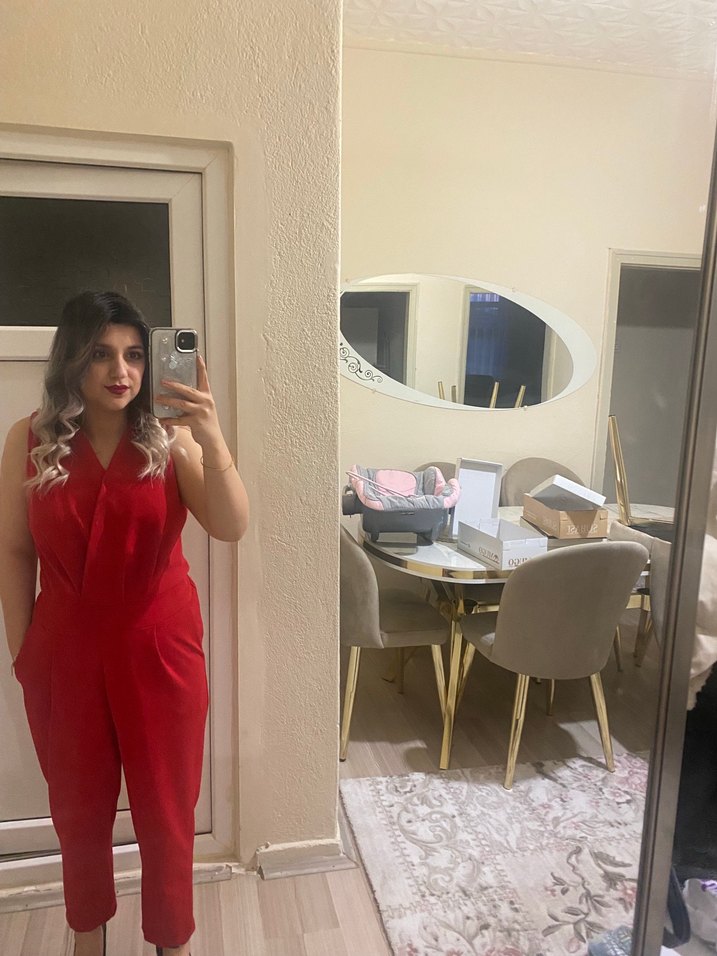 Kırmızı, v yakalı ve kolsuz, ipeksi kumaştan yapılmış oturmalı tulum, romantik akşamlar için zahmetsiz şıklık sunar. ✨Bilek paçadır