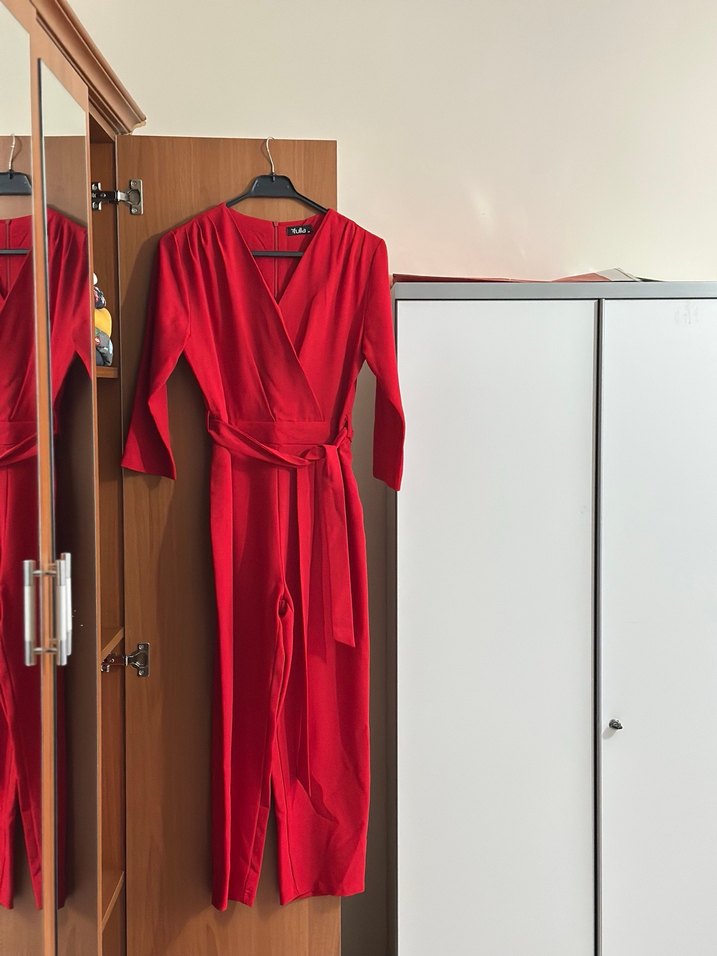 Kırmızı, saten dokulu, drapeli ve V yakalı uzun tulum. İnce kesimi ve askılı kollarıyla romantik akşamlar için modern ve şık bir seçim. Minimalist tarzda klasik zarafet sunar. ❤️