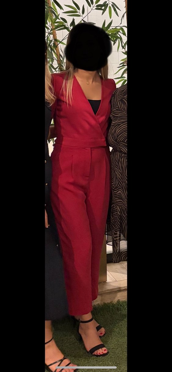 Kırmızı tulum, V yakalı ve askılı kollu, kemerli bel ile şekillendirilmiş. Sentetik kumaştan, normal kesim ve midi boy, ofis için uygun.