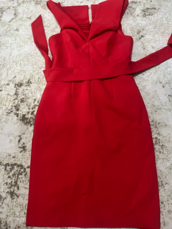 Bu kırmızı, kemerli ve V yakalı midi elbise, kolsuz ve parlak dokusuyla romantik akşamlar için şık bir tercihtir. Dikiş kısmından sökülmüş dikilebilir