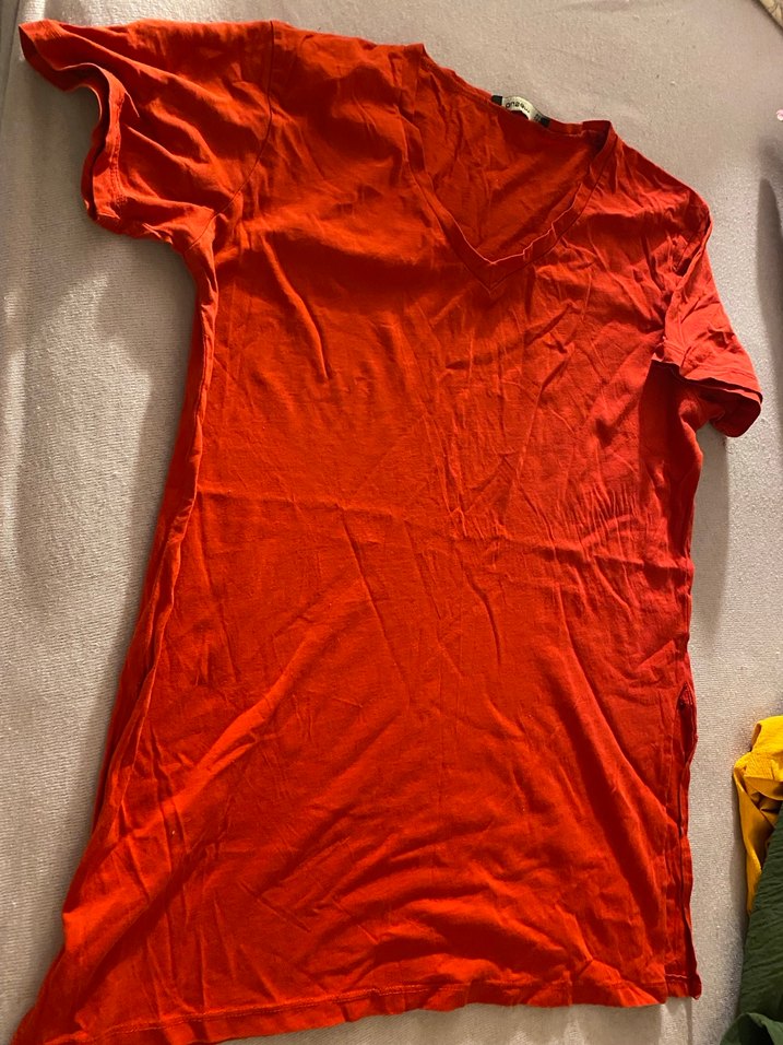 Kırmızı renkli, kısa kollu ve V yakalı hamile elbisesi. Yumuşak keten kumaştan, bol kesim ve midi boyda, günlük kullanım için uygun minimal sokak stiliyle.