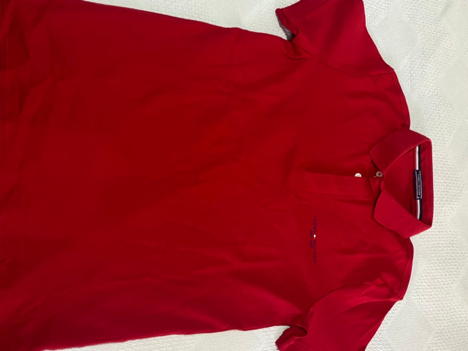 Kırmızı, dar kesim, V yakalı ve kısa kollu erkek polo tişört. Sentetik kumaştan üretilmiş, düğmeli ve sade tasarımlı, dış mekan için uygun.