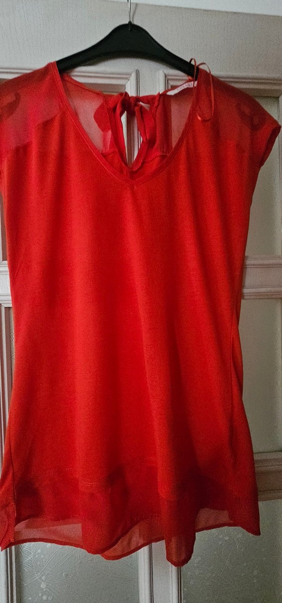 Kırmızı, V yakalı bluz, kısa kollu ve dökümlü tasarıma sahiptir. Satenimsi parlak kumaştan, rahat ve midi boyda, romantik akşamlar için uygundur.
