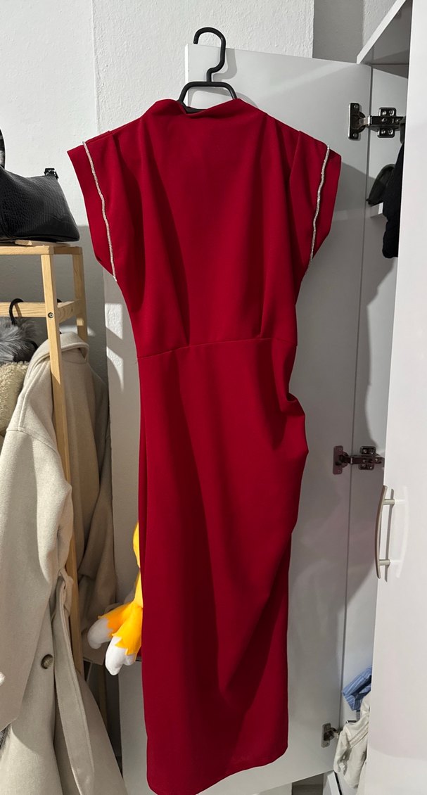 Drapeli, V yakalı ve kolsuz kırmızı midi elbise. Parlak kumaşı romantik akşamlar ve sokak modası için uygundur. ❤️ Alınnnn pisman olmayacaksiniz fizigi cok guzel gosteriyor