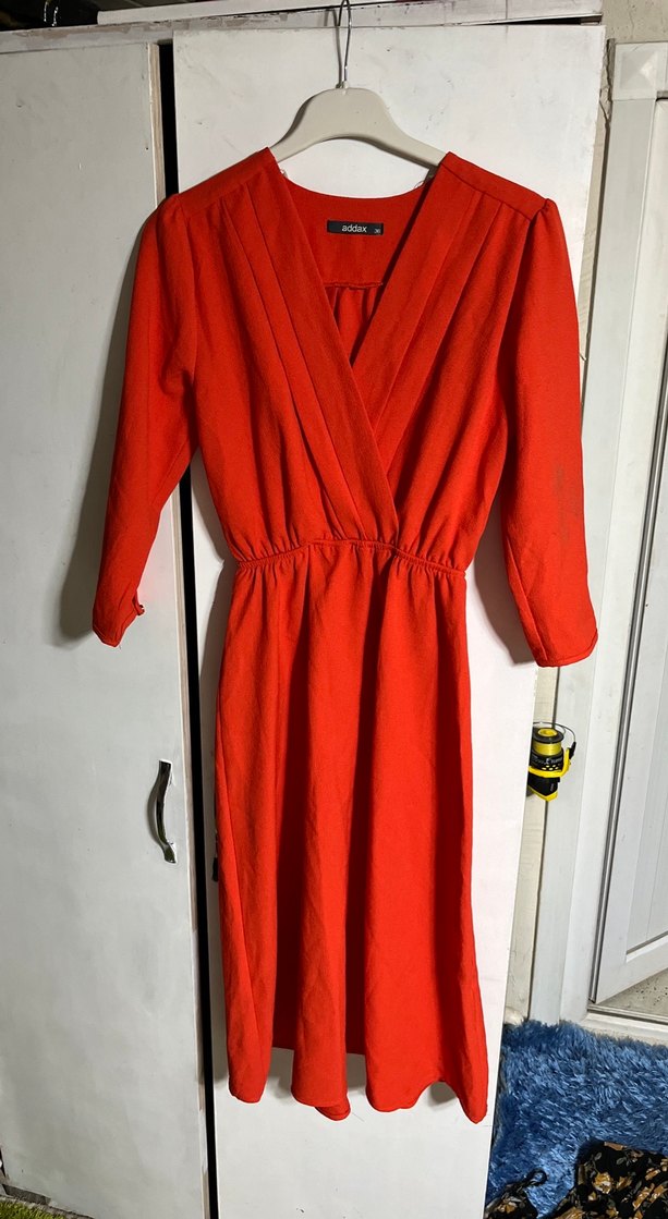 Kırmızı midi elbise, V yakalı ve uzun kollu drapeli tasarıma sahiptir. Keten kumaştan yapılmış, bol kesim ve ofis kullanımına uygundur.