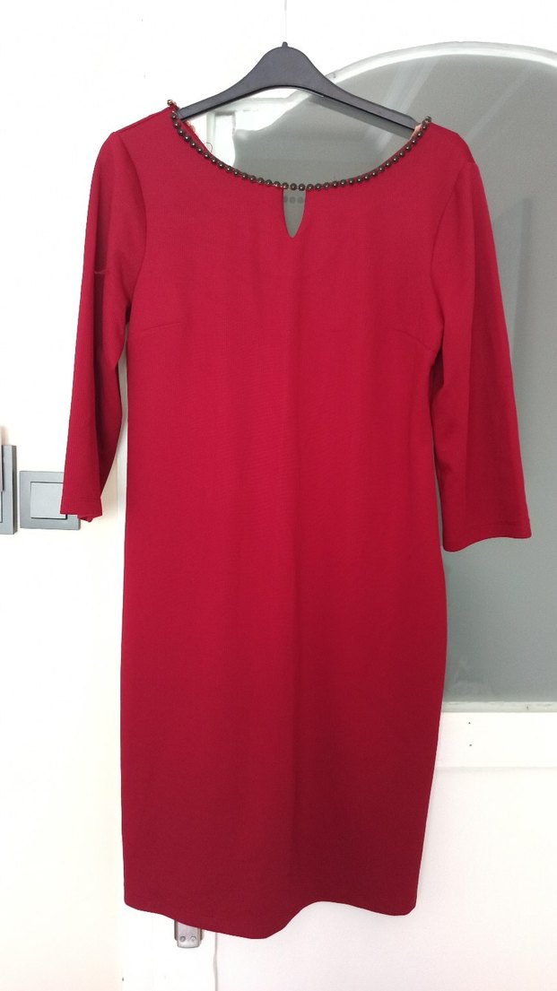 Parlak kırmızı midi elbise, boncuk detaylı V yaka, uzun kollu ve bol kesimle çağdaş, minimalist bir şıklık sunar. ✨