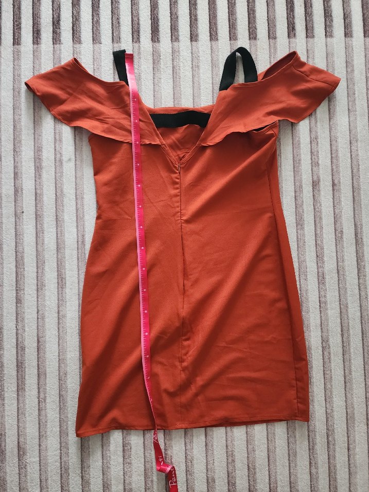 Koyu kırmızı, V yakalı ve askılı, beli kemerli, dar kesim midi elbise. Sentetik kumaştan, minimalist sokak stili için uygun.