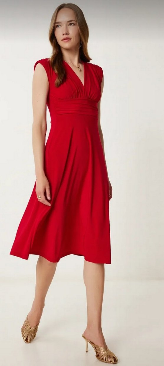 Parlak kırmızı, v yakalı ve drapeli midi boy, kolsuz elbise. Modern klasik tarzıyla romantik buluşmalar için ideal.