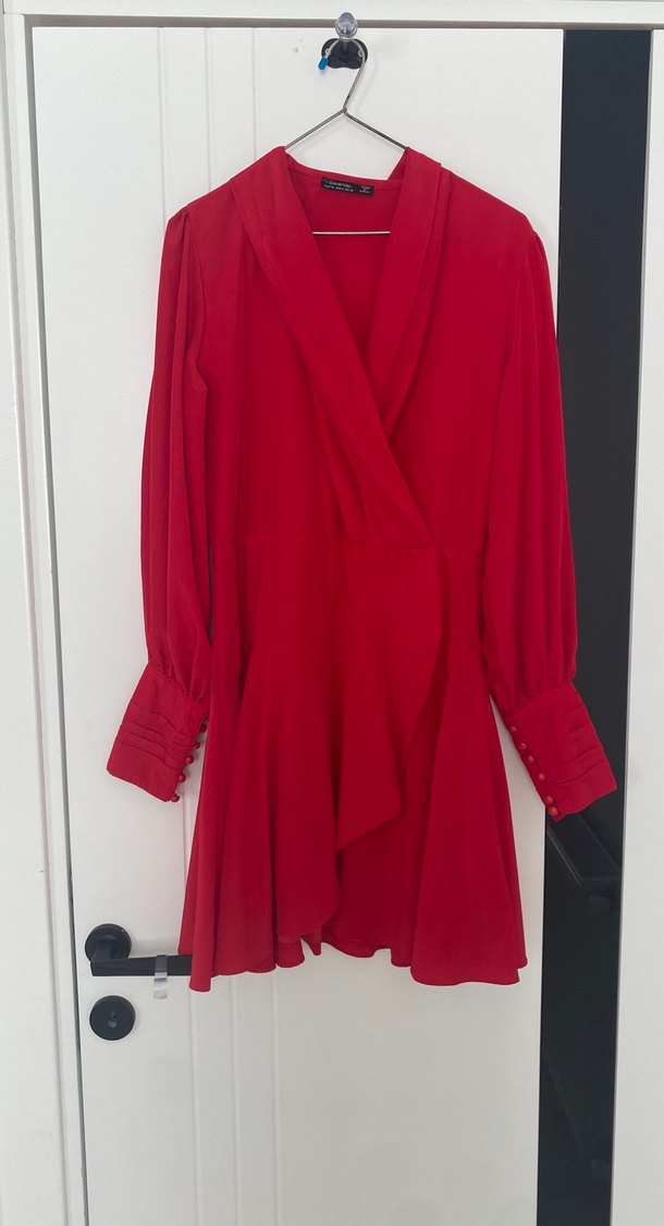 Uzun kollu, V yakalı kırmızı midi elbise, dökümlü tasarımı ve bol kesimiyle şık bir sokak stili sunar. Romantik akşamlar için uygundur. ❤️ S-M uyumlu sadece bir kere giyildi hiç bir kusuru yoktur