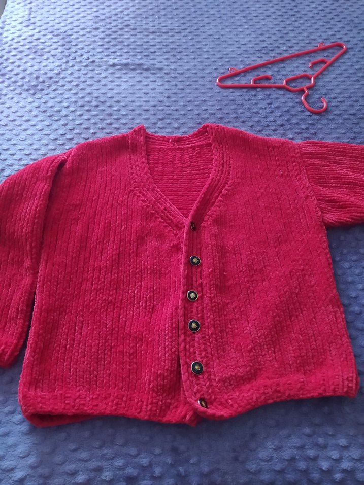 Kırmızı örgü hırkası, V yakalı ve uzun kollu, bol kesimdir. Günlük kullanıma uygun sade ve normal boydadır.