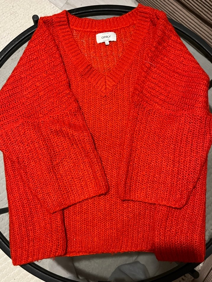 Parlak kırmızı renkte, V yakalı uzun kollu, örgü kadın kazak. Rahat kesimi ve normal boyu ile günlük sokak stiline uygundur.