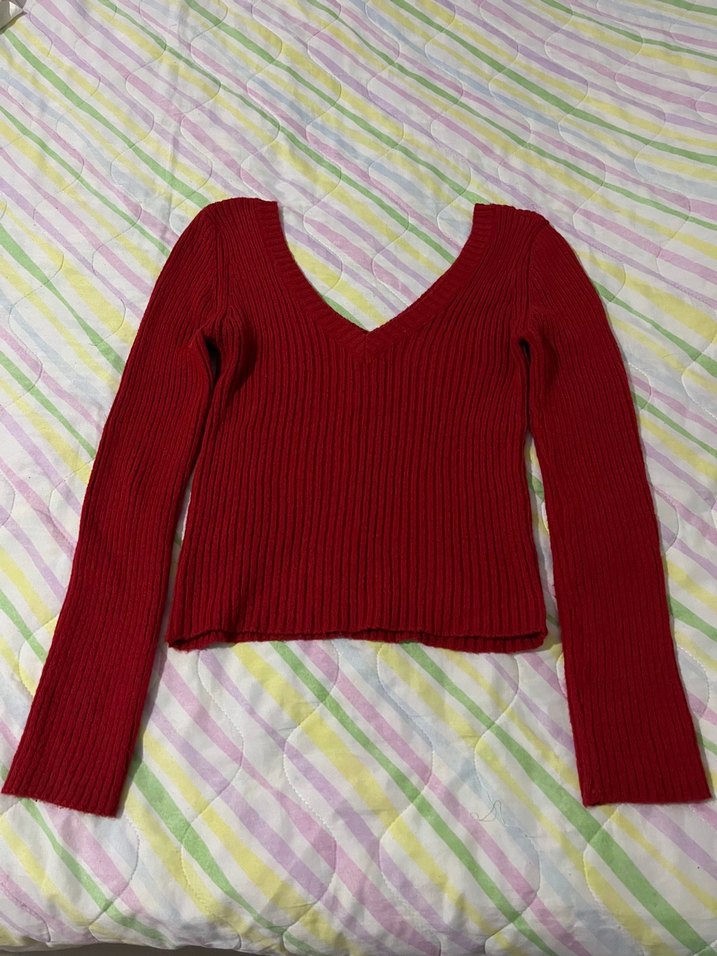 Kırmızı renkte, V yakalı ve uzun kollu, triko kumaştan yapılmış, normal boyda ve rahat kesimli kadın kazak. Günlük kullanıma uygundur.