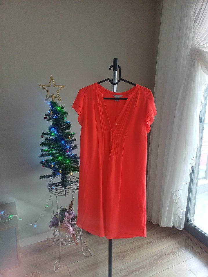 Kırmızı renkli, V yakalı ve kısa kollu elbise İpek gibi kumaştan, salaş ve midi boyda, günlük kullanıma uygun.