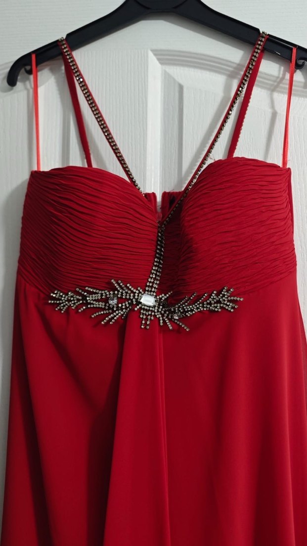 V yakalı, ince askılı, drapeli kırmızı abiye elbise. Parlak nakış detaylı, modern tarzda, düğün için uygun uzun kesim.