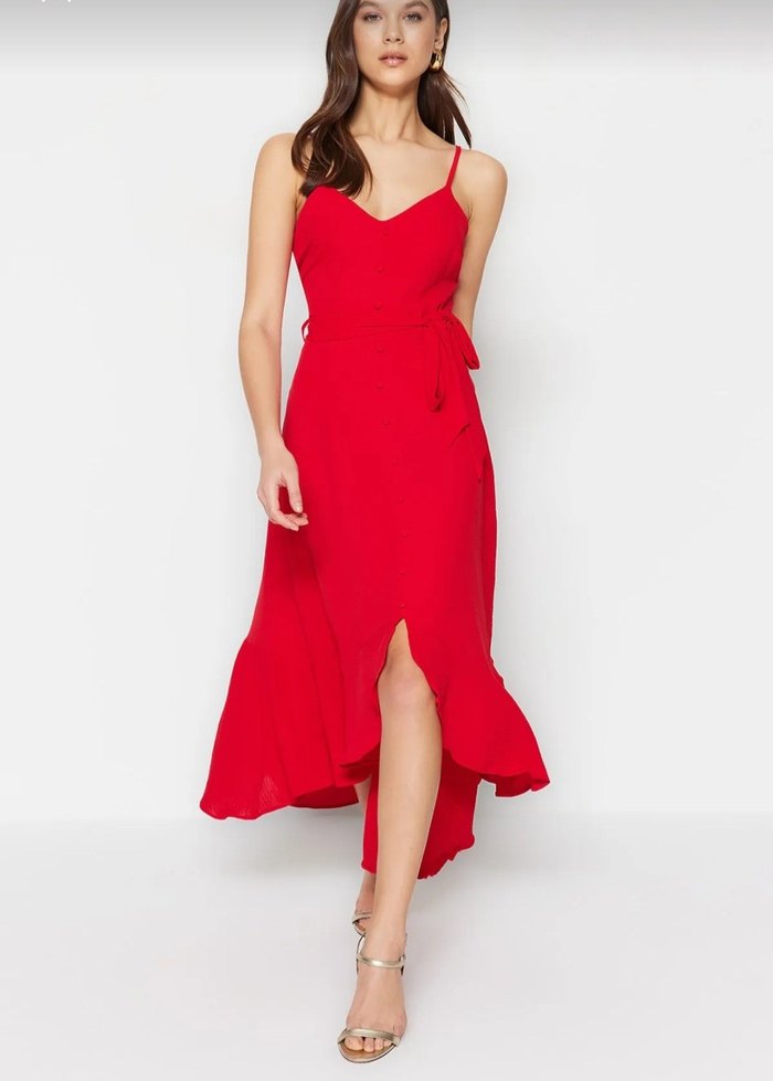 Kırmızı V Yakalı Uzun Askılı Elbise