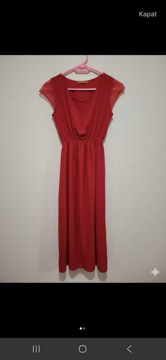 V yakalı, drapeli, kolsuz ve uzun boyda kırmızı elbise. Sentetik kumaştan, bohem tarzda, günlük kullanım için uygundur.