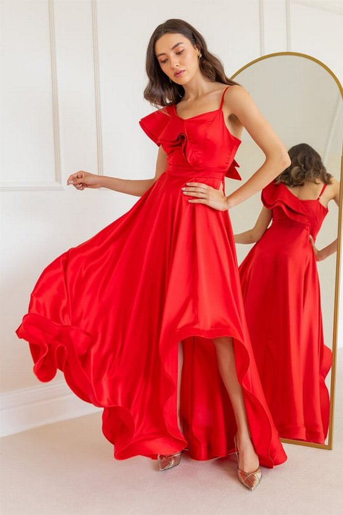Parlak kırmızı renkli, V yakalı, kolsuz, uzun ve drapeli kadın elbisesi. Salaş kesimi ve minimalist, çağdaş tarzıyla düğünler için uygun.