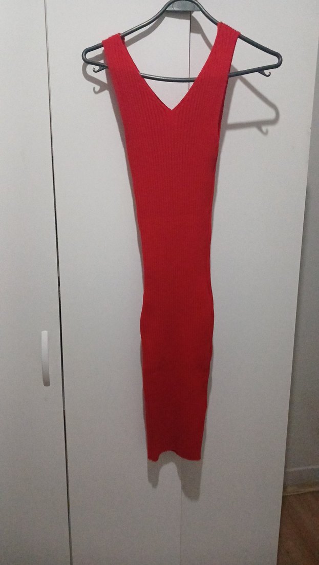 Kırmızı renk, V yakalı ve ince askılı uzun elbise. Esnek sentetik kumaştan yapılmış, günlük kullanıma uygun minimal ve şık tasarım.