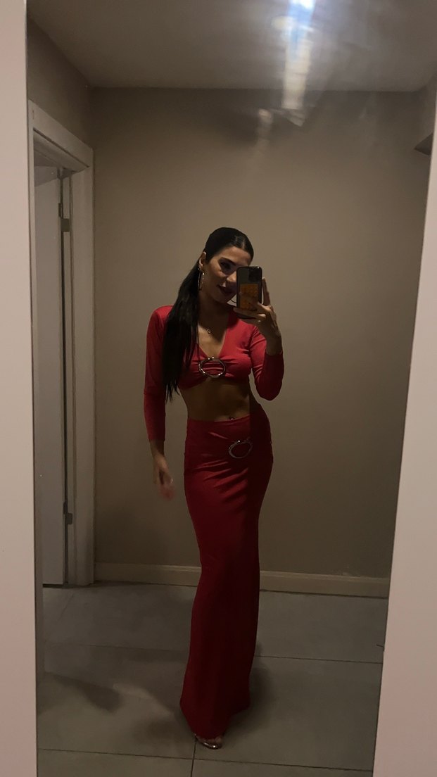Kırmızı, V yakalı ve askılı kollu, saten dokulu uzun ve vücuda oturan elbise. Romantik gece için şık ve iddialı bir seçim. M bedene de çok rahat olur.