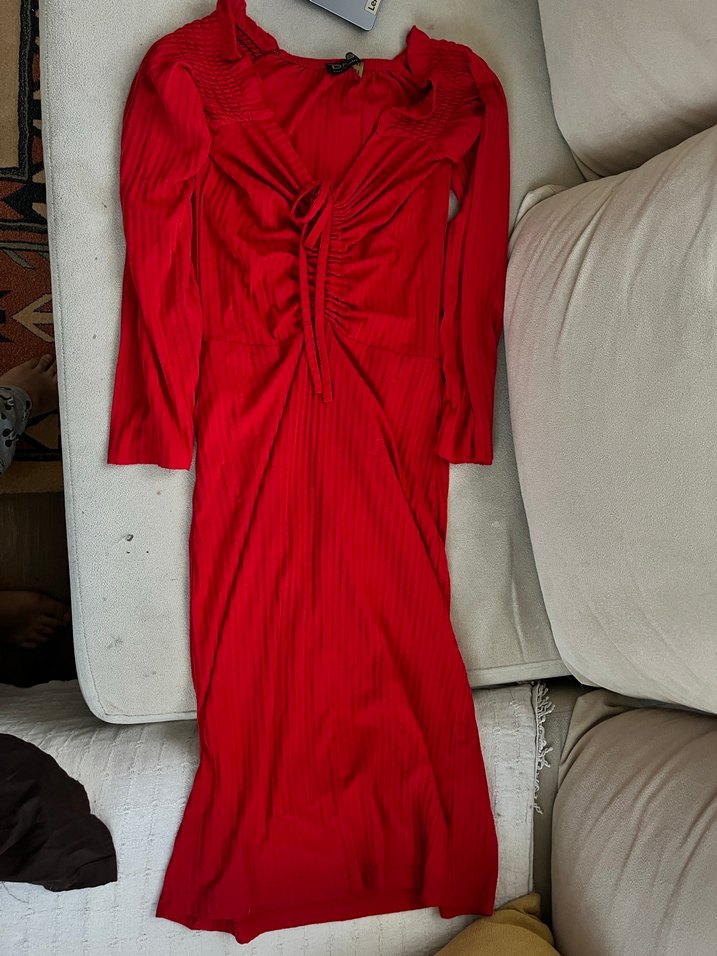 Kırmızı uzun, v yakalı ve uzun kollu elbise, pile detaylarıyla modern klasik tarz sunar. Düz, sentetik kumaştan yapılmıştır.