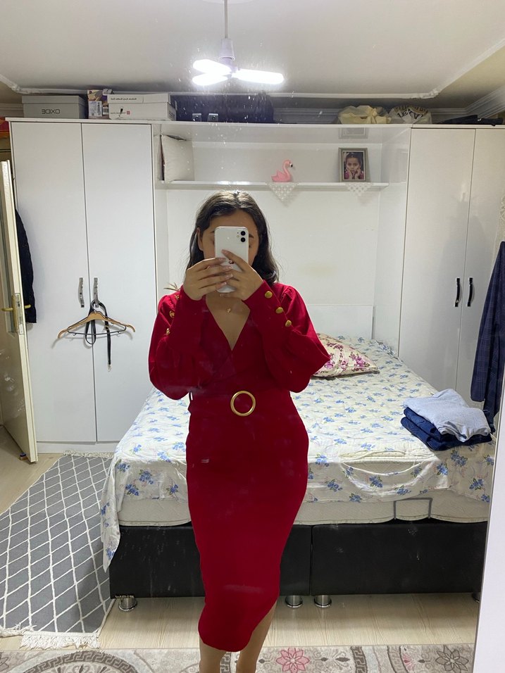 Kırmızı V Yakalı Uzun Kollu Midi Elbise