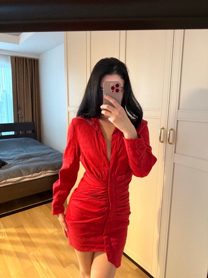 Kırmızı, v yakalı, uzun kollu, yırtmaçlı ve saten dokulu mini elbise, şık sokak tarzı için uygundur. Romantik buluşmalar için ideal. ❤️