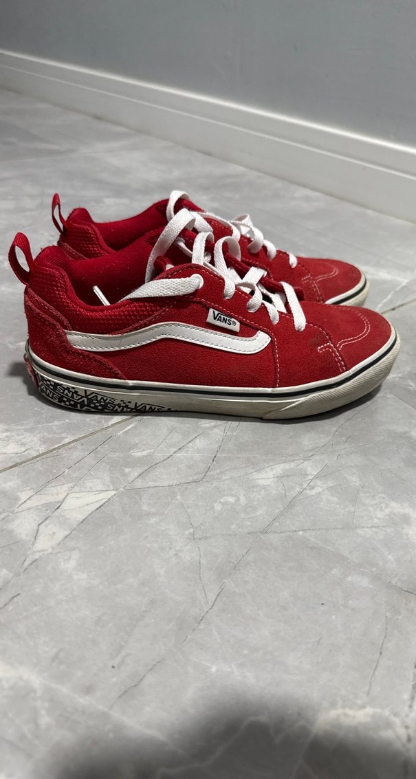 Vans markalı erkek spor ayakkabısı, kırmızı renkte, dolgu topuklu ve bağcıklı.Spor ve sokak stili için uygundur, kauçuk tabanlıdır. 34 numaradır. Çok az kullanıldı. Orijinal üründür.