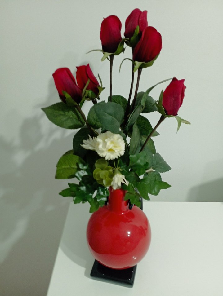 Kırmızı Vazo İçinde Yapay Gül Buketi