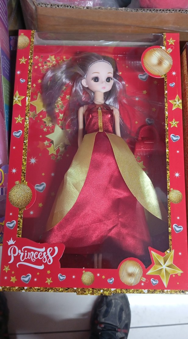 Renkli bu bebek, kırmızı ve altın renkli parlak kumaştan bir elbise giyiyor. Uzun saçları arkada toplanmış ve yıldız ile kalp desenli kutuda sunuluyor.