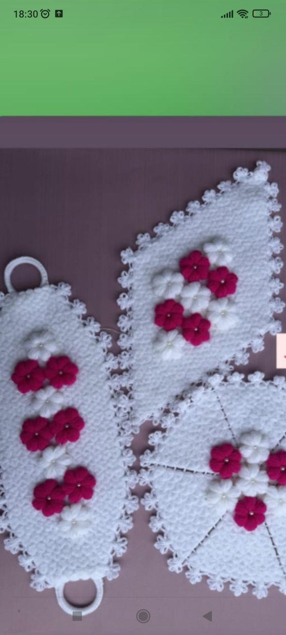 Kırmızı ve beyaz çiçeklerle süslenmiş beyaz el örgüsü geleneksel set, dekoratif kullanım için uygundur.