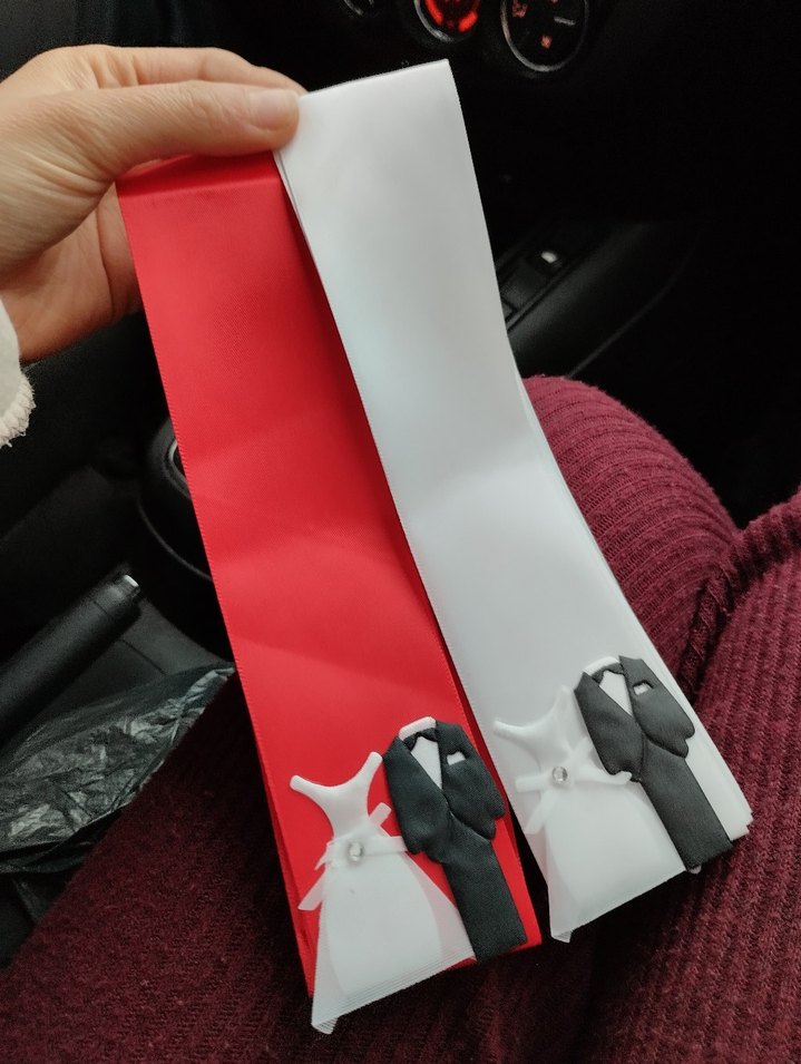 Kırmızı ve beyaz renklerde, damat ve gelin figürlü düğün kurdeleleri,