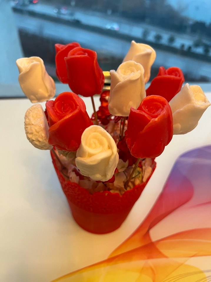 Kırmızı ve Beyaz Mum Gül Detaylı Renkli Vazo