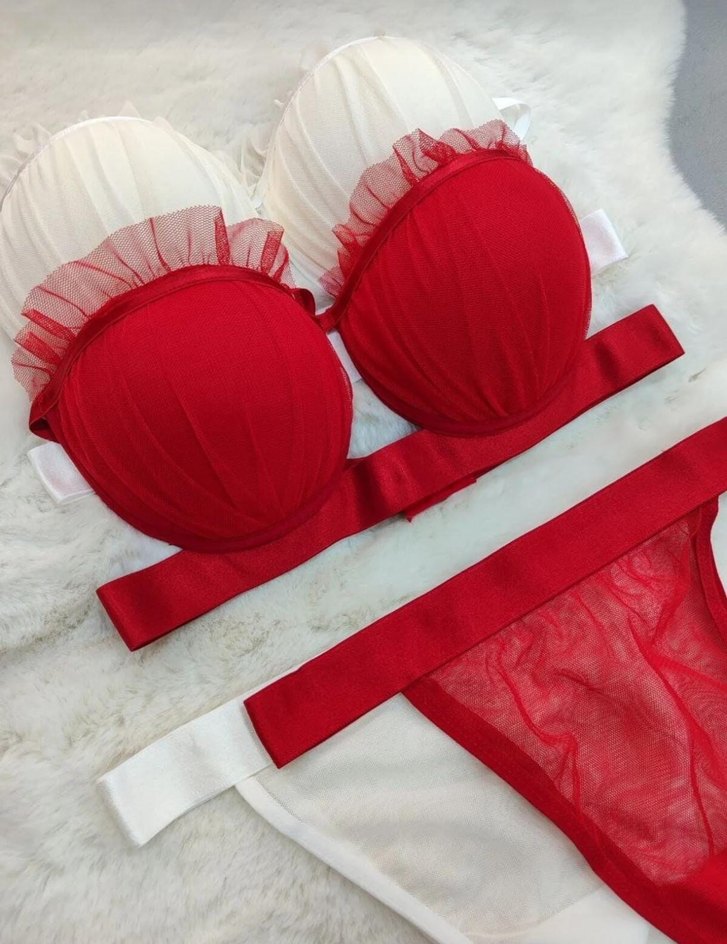Kırmızı ve beyaz renklerde, modern Paris kültürünü yansıtan, desen içermeyen sütyen ve midi uzunlukta külot seti. Fırfırlı detaylarıyla şık ve rahat bir tasarım. bedenleri mevcuttur ❤️