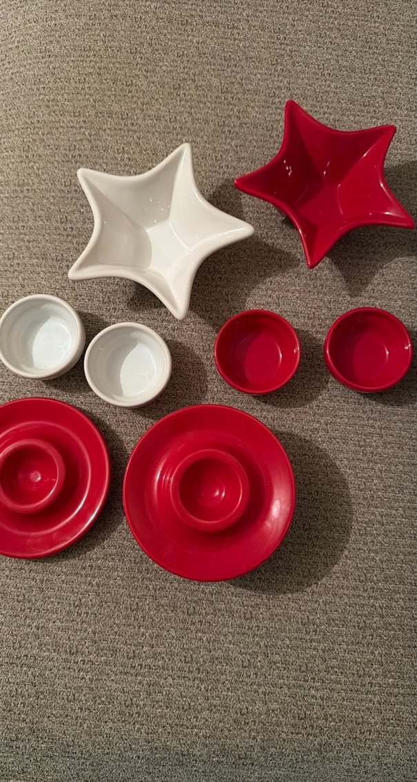 Kırmızı ve beyaz renkte, modern tasarımlı, desen içermeyen tabak ve kase seti. ️6 lı yumurtalık