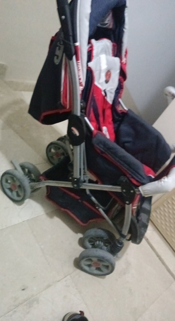 Bu bebek arabası kırmızı oturma alanı ve gri tekerleklere sahip sağlam bir yapıya sahiptir. Rahat ve kullanışlıdır.