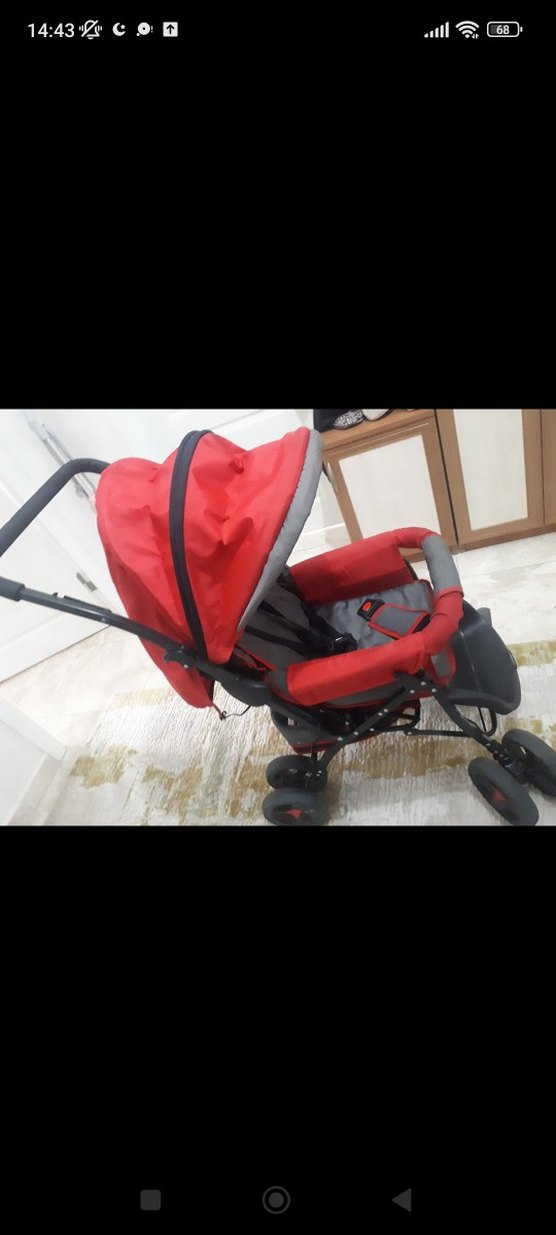 Kırmızı tente ve oturma alanı, gri detaylarla sağlam çerçeveli bebek arabası. Güvenlik kemerleri ve kolay hareket için çok tekerlekli. çift taraflı kullanılır freni vardir