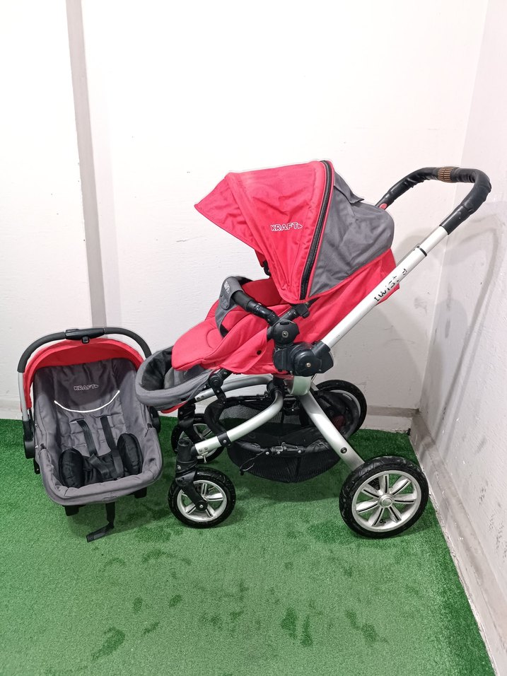 Kırmızı ve gri renklerde, tente ve uyumlu bebek oto koltuğu içeren bebek arabası seti. Dayanıklı tekerlekler ve konforlu tutma kolu bulunur. Hiçbir sorun sıkıntısı yok tertemiz sağlamdır alabilirsiniz bende birsürü bebek arabası var sayfama bakabilirsiniz