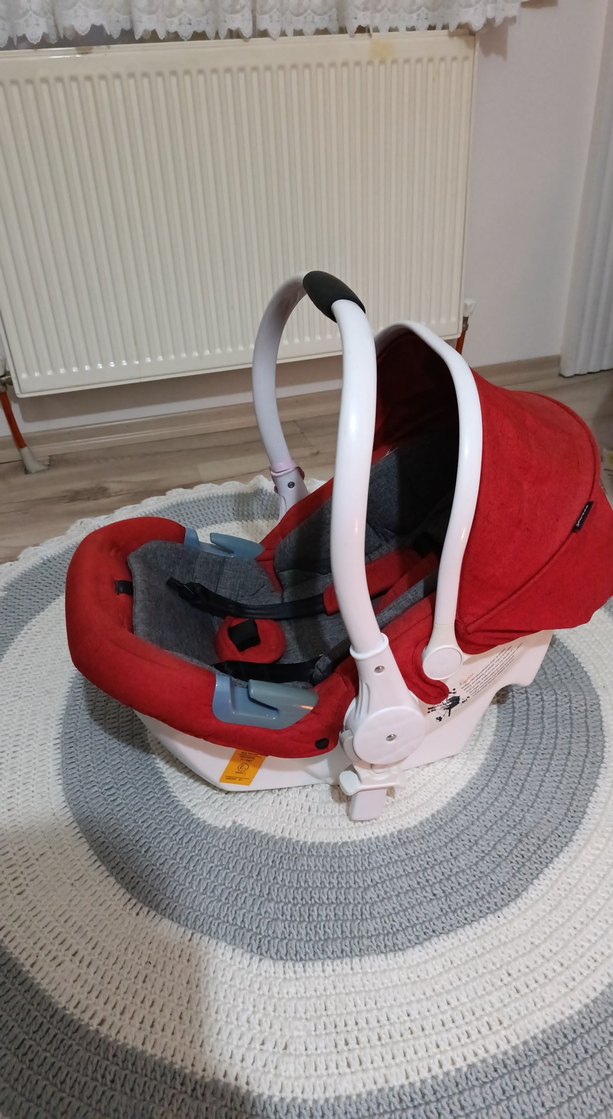 Kırmızı ve gri renklerde, taşıma sapı ve tente bulunan bebek oto koltuğu. Güvenlik kemeri ve yumuşak iç kısmı ile rahatlık sağlar.