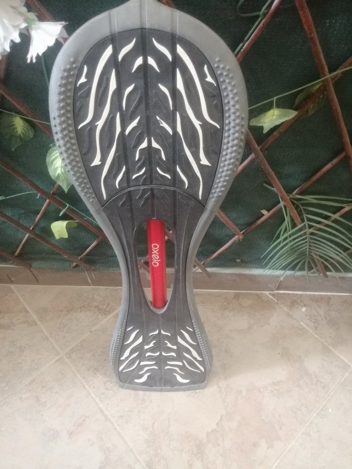 Kırmızı çerçeveli, kaymayı önleyen dokulu gri platforma sahip çocuk kaykay scooter. Çocuklar için uygundur ve eğlenceli bir sürüş sunar.