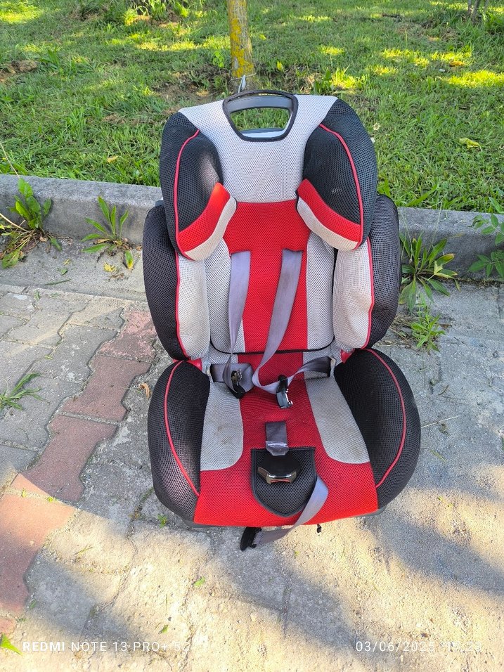 Kırmızı ve gri renklerde, yanları dolgulu ve ayarlanabilir emniyet kemerli çocuk oto koltuğu. marka temsili secildi