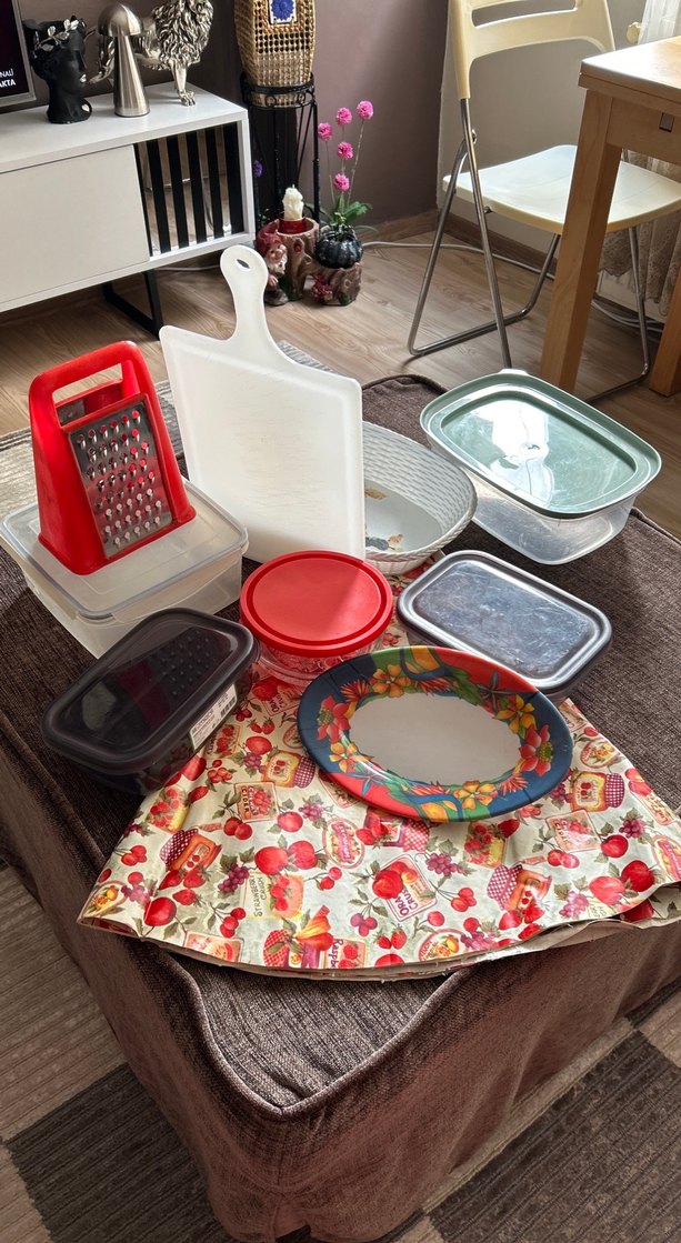 Kırmızı rende, beyaz kesme tahtası, kapaklı saklama kapları ve renkli melamin tabak ile birlikte çiçek desenli bir bez içeren mutfak gereçleri seti. ️9 adet çok uygun fiyata